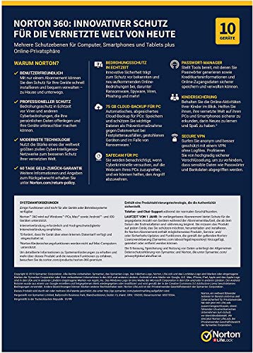 Das neue Norton 360 Premium bietet leistungsstarken. Mehrschichtigen Schutz für Ihre Geräte und Ihre online-privatsphäre – alles in einer einzigen Lösung. Ihre PCs, Macs, Tablets und Smartphones profitieren von Funktionen zum Schutz vor Viren, Ransomware, Phishing und anderen Online-Bedrohungen, während sie im Internet Bankgeschäfte erledigen, einkaufen und surfen. Unser Secure VPN trägt sowohl zu Hause als auch unterwegs durch hochgradig sichere Verschlüsselung zum Schutz Ihrer persönlichen Informationen bei, wenn diese über Ihre Geräte übertragen werden. Es hilft zu verhindern, dass cyberkriminelle Ihre persönlichen Informationen abfangen, wenn Sie sich mit WLAN-Netzen Verbinden – sogar im öffentlichen WLAN. Außerdem enthält das neue Norton 360 Premium ein cloud-backup für PC zur vorbeugung vor Datenverlust Infolge von festplattenausfällen, Geräte Diebstahl und sogar Ransomware, den Passwort Manager mit Tools zur Verwaltung Ihrer Passwörter und logins sowie eine Kindersicherung.