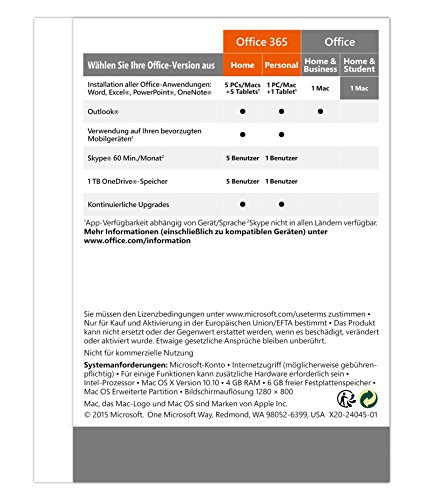 Specification: Microsoft Office Mac Home and Student 2016 (Product Key Card ohne Datenträger)