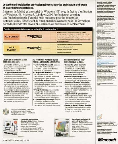 Microsoft veröffentlichte diese neue Windows (Version 5.0, Build 2195) im Februar 2000. Es ist das Desktop-Betriebssystem der neuen Windows 2000 Plattform für die x86 Architektur und umfasst auch die Varianten Windows 2000 Server, Windows 2000 Advanced Server und Windows 2000 Datacenter Server. Windows 2000 vereint grob definiert die Benutzerfreundlichkeit, Plug&Play und USB Geräteunterstützung von Windows 98 und die Sicherheit und Stabilität der Windows NT Familie. Es ist ein Multitasking-, Multiprocessing-Betriebssystem und unterstützt mit SMP bis zu 2 Prozessoren der x86 32-Bit und 64-Bit Architektur. Threads oder Prozesse können festlegen auf welcher CPU diese laufen. Dazu kommen neben der kompletten Überarbeitung neue Features und viele Verbesserungen. Das Ergebnis ist eine hohe Kompatibilität, vereinfachte Verwaltung, gesteigerte Hardwareunterstützung mit über 7.000 Geräten, Dateiverwaltung und erweiterte Sicherheitsfunktionen. Als Einsatzgebiet eignet sich dieses Betriebssystem als Einzelplatzrechner oder als Client im Firmennetzwerk. Das Betriebssystem wird um die Spiele-Schnittstelle DirectX 7.0 ergänzt, der Internet Explorer 5.0 bietet Zugriff auf das Internet. Beim Zugriff auf Dateien, Drucker oder andere Computer authentifiziert Windows 2000 erst den Benutzer. Netzwerke werden mit den Protokollen TCP/IP, NWLink und AppleTalk unterstützt. Windows 2000 unterstützt den Datenaustausch in dezentralen Arbeitsgruppen und zentralen Domänen. Systemvoraussetzungen: – 133 MHz Pentium-kompatibler Mikroprozessor oder höher; Windows 2000 Professional unterstützt Systeme mit einem oder zwei Prozessoren – Mindestens 64 MB Arbeitsspeicher empfohlen. Mehr Arbeitsspeicher steigert die Systemleistung. (Maximal 4 GB) – 2 GB Festplatte mit mindestens 650 MB verfügbarem Festplattenspeicher – CD-ROM oder DVD-ROM-Laufwerk – VGA-Monitor oder Monitor mit höherer Auflösung – Tastatur – Microsoft Maus oder kompatibles Zeigegerät (optional)