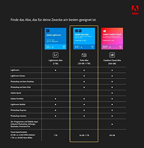 Das Adobe Creative Cloud Foto-Abo enthält Lightroom für den Desktop sowie für Lightroom Mobile für iOS und Android, Lightroom Classic und Photoshop. Die Desktop- Versionen können auf 2 Rechnern gleichzeitig installiert werden.