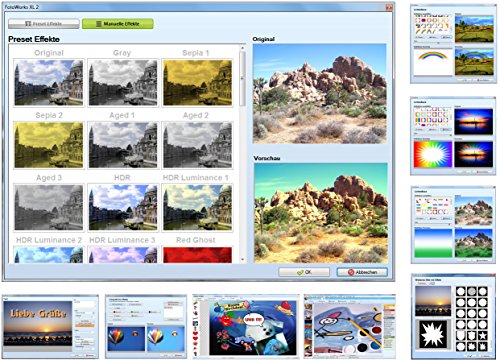 Das Fotobearbeitungsprogramm richtet sich an Anwender die z.B. Fotos bearbeiten, Bilder verbessern, drehen, zuschneiden oder zahlreiche andere Effekte einsetzen möchten. Texte, Cliparts, Symbole oder andere Bilder können in Fotos eingefügt werden. Egal ob eine Fotocollage erstellt werden soll oder per Stapelverarbeitung ein ganzer Ordner Bilder verkleinert, automatisch verbessert oder in schwarz/weiß umgewandelt werden soll. Die Foto Software kombiniert die Bildbearbeitung mit erweiterten Features wie z.B. Preset Effekte, Lichtreflex Effekte, Schärfer/Weichzeichner, Masken und Texturen.