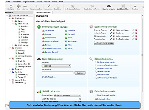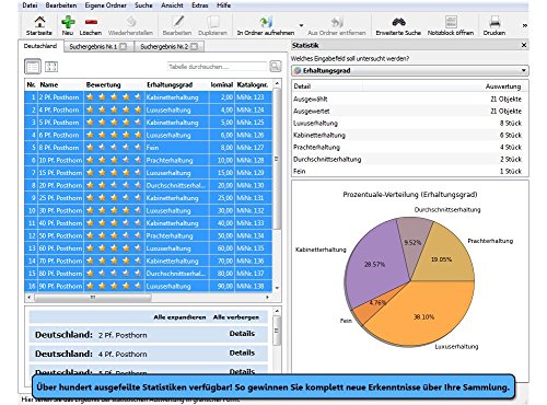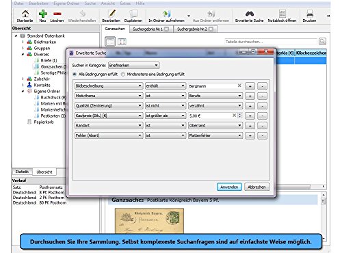 Mit dieser ausgefeilten Software digitalisieren Sie Ihre gesamte Briefmarkensammlung. Sie behalten Kosten und Verkaufserlöse im Blick, erzeugen Auswertungen, Übersichten sowie Statistiken. Sogar den Wert und die Wertsteigerung Ihrer Sammlung können Sie direkt ermitteln, Fotoalben und vieles, vieles mehr erstellen.