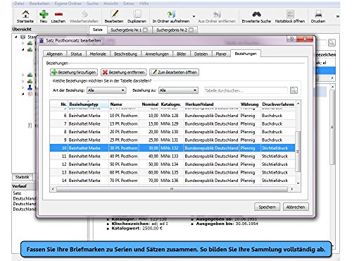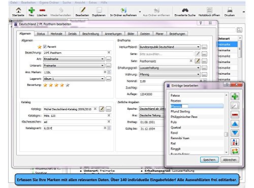 Doch Sie können nicht nur Ihre Briefmarken erfassen, sondern auch Ihre Ganzsachen, Briefe, Markenheftchen, Ihre Fachliteratur, wichtige Kontakte und all Ihr Zubehör, um nur einige Beispiele zu nennen.