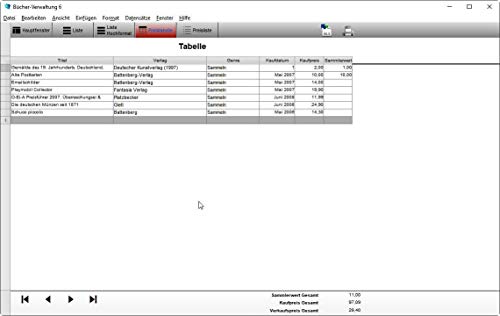 Natürlich können Sie Ihre Schätze nach beliebiges Kriterien sortieren und als Formular, Liste oder Tabelle darstellen und ausdrucken. Sammlerwert, Kaufpreis und Verkaufspreis werden automatisch summiert und so der Wert der Sammlung schnell ermittelt.