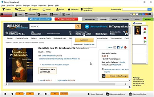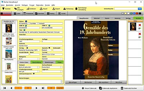 Sie müssen nicht alle Daten selbst eingeben. Anhand der ISBN-Nummern oder des Titels können Sie die Daten Ihrer Bücher aus dem Internet übernehmen. Weitere Bilder können Sie per Drag & Drop vom internen Internetfenster in die Bildfelder verschieben.