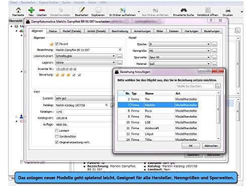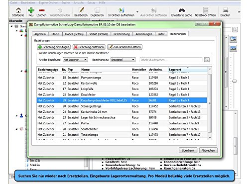 Dabei spielt es keine Rolle wie viele Lokomotiven, Waggons, Gebäude, Figuren, Autos usw. Sie besitzen – mit dieser Software verwalten Sie einfach alles rund um Ihr Hobby. Doch Sie können nicht nur Ihre Modelle erfassen, sondern auch Ihre Fachliteratur, beliebte Händler, wichtige Kontakte und all Ihre Ersatz- und Elektronikteile, um nur einige Beispiele zu nennen.