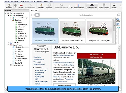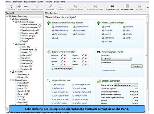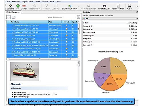 Mit dieser umfangreichen Software digitalisieren Sie Ihre gesamte Modellbahnsammlung. Sie behalten Kosten und Verkaufserlöse im Blick, erzeugen Auswertungen, Übersichten sowie Statistiken. Sogar den Wert und die Wertsteigerung Ihrer Sammlung können Sie direkt ermitteln, Fotoalben und vieles, vieles mehr erstellen.