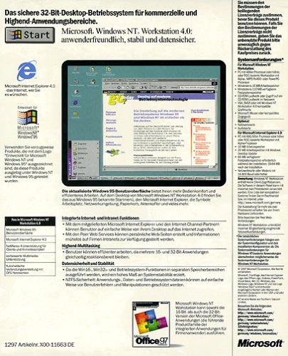 Mit Windows NT 4.0 brachte Microsoft 1996 eine technisch lediglich überarbeitete Version von Windows NT auf dem Markt. Allerdings wurde die moderne Oberfläche des Konsumerbetriebssystems Windows 95 übernommen und daher gibt es einen deutlicheren Optischen Unterschied. Zudem setzte Microsoft nun vermehrt auf Intra- und Internetserverfähigkeiten. Die Neuerungen von NT 4.0 in der Übersicht: – Windows 95 Benutzeroberfläche, inklusive Explorer, Aktenkoffer, Papierkorb und Netzwerkumgebung. – Telefon-API (TAPI) und Unimodem für Faxanwendungen, Exchange (EMail) und Internetexplorer. – Unterstützung von NetWare 4. – Peer Web-Dienste für Intranet Webserver. – Microsoft Internet Explorer. – DCOM für verteilte Anwendungen für das Internet. – Windows Exchange für die Verwaltung von internen und externen EMails. – Direkte Unterstützung von Grafik- und Audioanwendungen. Windows NT 4.0 Workstation kam stets auf CD-ROM. Für ältere Computer waren 3 Bootdisketten inkludiert, die CD-ROMs waren aber bootfähig. Es gab nur zwei Generationen an CD-ROMs, die vom ersten Release und neuere mit integriertem Servicepack 1. Bei späteren Paketen wurde ein höheres Servicepack stets als weitere CD-ROM beigelegt. Die OEM Versionen wurden meistens mit einem Handbuch mit aufgeklebtem oder integriertem COA-Echtheitszertifikat geliefert. Auch hier gab es bootfähige CD-ROMs welche entweder kein oder oder das erste Servicepack integriert hatten.