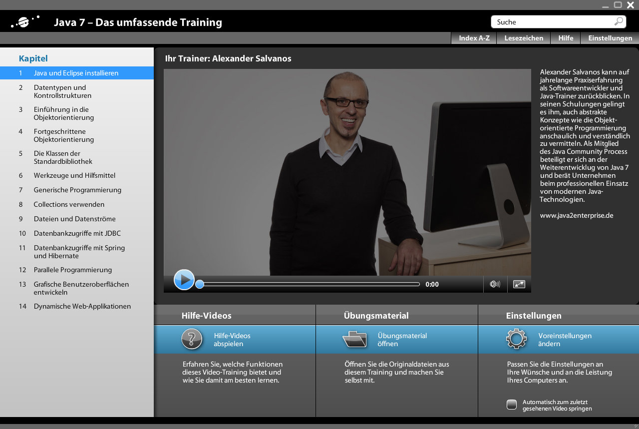 Das Video-Training vom Java-Experten Navigieren mit Menü, Suche, Lernschritten