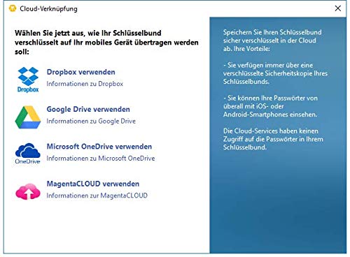 - NEU! Vollsynchronisation zwischen Mobile Privacy Apps und Steganos Passwort-Manager 20 über OneDrive, Google Drive, Dropbox oder MagentaCLOUD